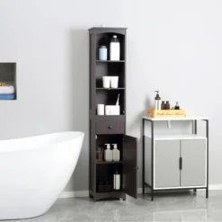 HOMCOM 6” X 20.5” X 26” Wood Rolling Narrow Bathroom Side Storage Cabinet – White