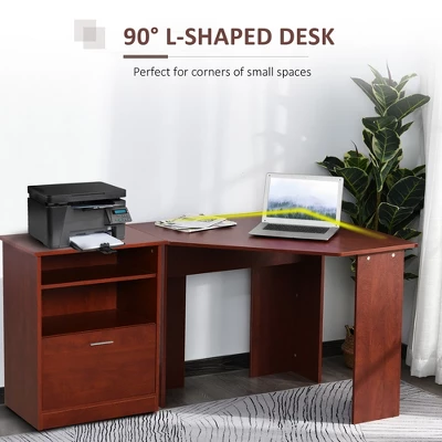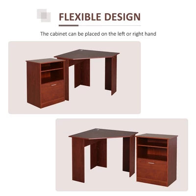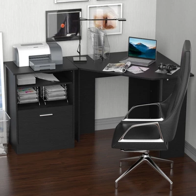 Efficiently save space with this corner computer desk from HomCom. Constructed from a durable class P2 particle board with a smooth and easy-to-clean melamine surface, this computer desk features a large surface to suit you and the shape of your living space. There’s room for both monitor and laptop on this office desk. Plus, there are two shelves and a slide-out drawer for a printer, books, stationery and decorative items. this computer desk and cabinet have a contemporary look that will blend beautifully into any style décor.