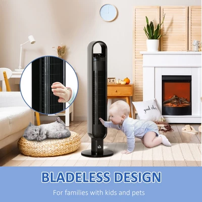 - SAFETY GRILLE: Protect children and pets from potential risks. TOWER FAN INFORMATION: Overall Dimensions: 11″ L x 11″ W x 39.25″ H. Noise: 60 dB.