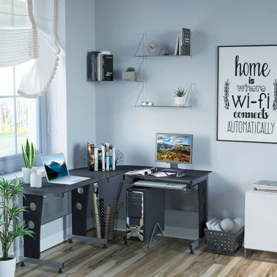 This modern home office desk with storage from HomCom is the perfect addition to any work or gaming focused office. The compact L-shaped corner design gives you maximum desktop space while still fitting into almost any size area. The desktop surface is made from thick tempered glass keeping it lightweight but sturdy. A steel frame makes it durable, stable, and ready for long days and nights. To maximize available space there is a built-in keyboard tray as well as space for your CPU on the mobile tower rack. The sleek look and high-functioning design make this computer desk with shelves the perfect addition to any home office, dorm room, or workspace. Make your work area the ultimate place for efficiency with this HomCom L-shaped computer desk.