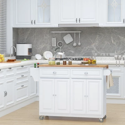 Add elegance and extra storage to your home with this rolling kitchen cabinet organizer with a drop leaf from HOMCOM. Designed with functionality, this large kitchen island cart will make your life easier while adding taste and style to your kitchen. The durable wood materials feature handsome pine wood with a rubberwood top for a sophisticated look. The drawers and cabinets can be used as a pantry or to store dishes, basins, pans, etc. A handy towel rack, and wooden handle on either sides offers even more convenience and an effortless way to transport. With 4 omnidirectional wheels with 2 brakes provide easy movement and steady placement for when you’e working in the kitchen. The drop leaf counter top is idea for small kitchens that need more workspace or extending your cooking space and conveniently drops down when not in use. Whether you want an additional work surface, to get organized, or simply need a way to maximize your existing space,HOMCOM has got you covered with a stylish solution to your storage dilemma.